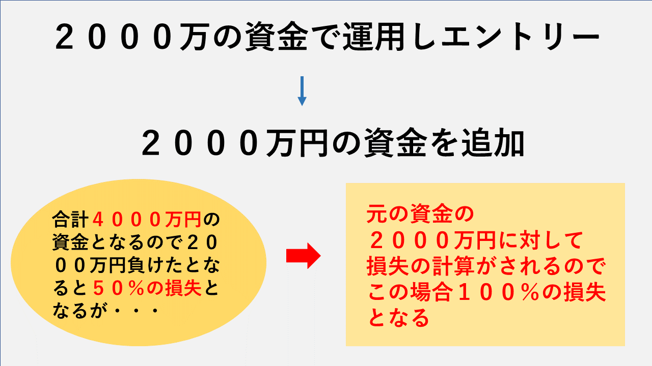 なので2000万円の資金でエントリーして2000万負けて、追加で2000万円いれていたとしても損失が50%にはならないんですね。