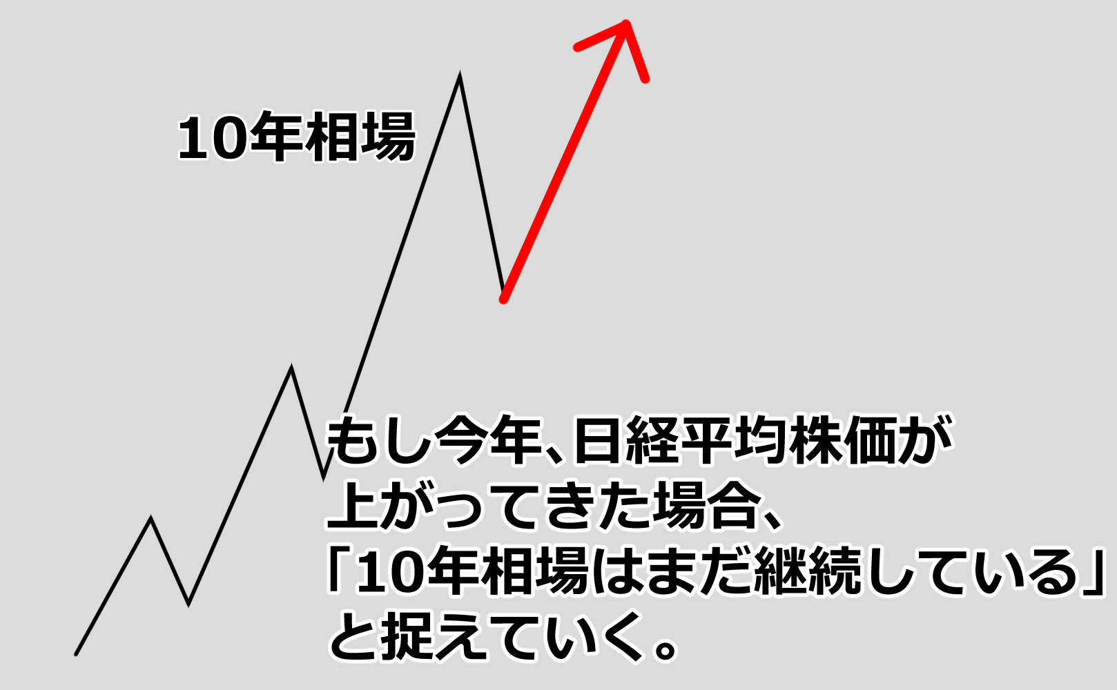 ただ、もし「3.縦方向に大きく上がっていく」動きになった場合、これまで言われていた「10年相場が終わった」は否定され、「10年相場はまだ継続している」と考えていきます。