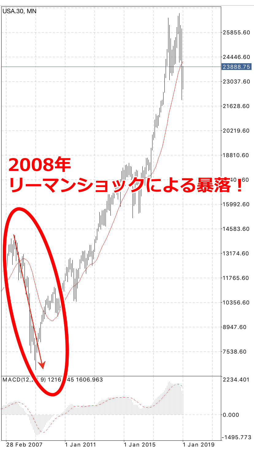 この○で囲んでいるとことは、ちょうどリーマンショックで大きく株価が暴落した10年前になります!