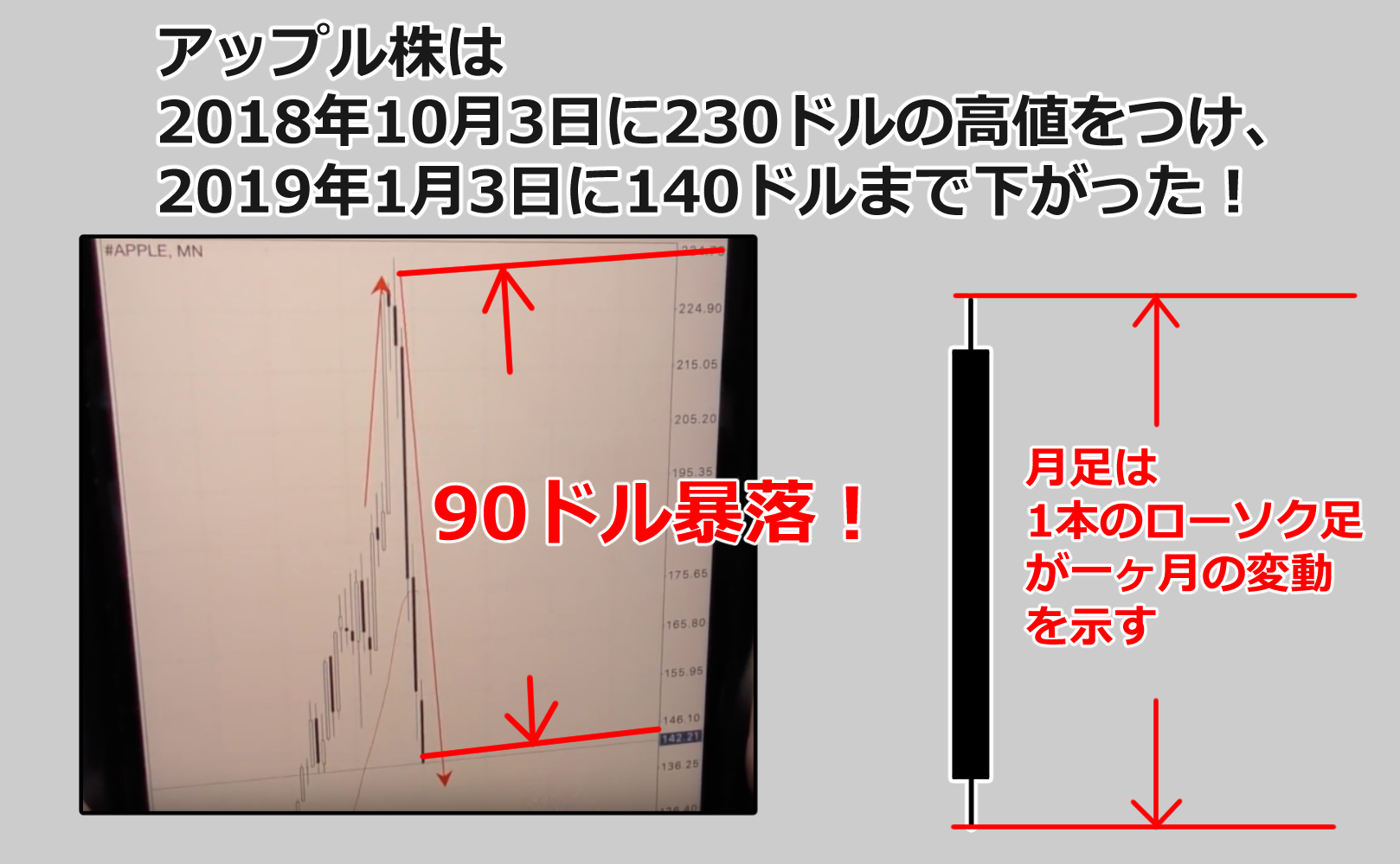 アップル株は、2018年10月3日に230ドル(約25,300円)の高値を付けたあと、今年の1月3日に最安値140ドル(約15,400円)まで下がり、結果90ドル(約9900円)の落差になりました!