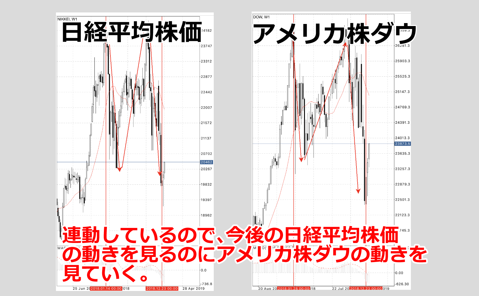 ちなみに、なぜここでアメリカ株ダウを出したのかというと、アメリカ株ダウと日経平均株価の動きはよく似ていて、連動しています。
