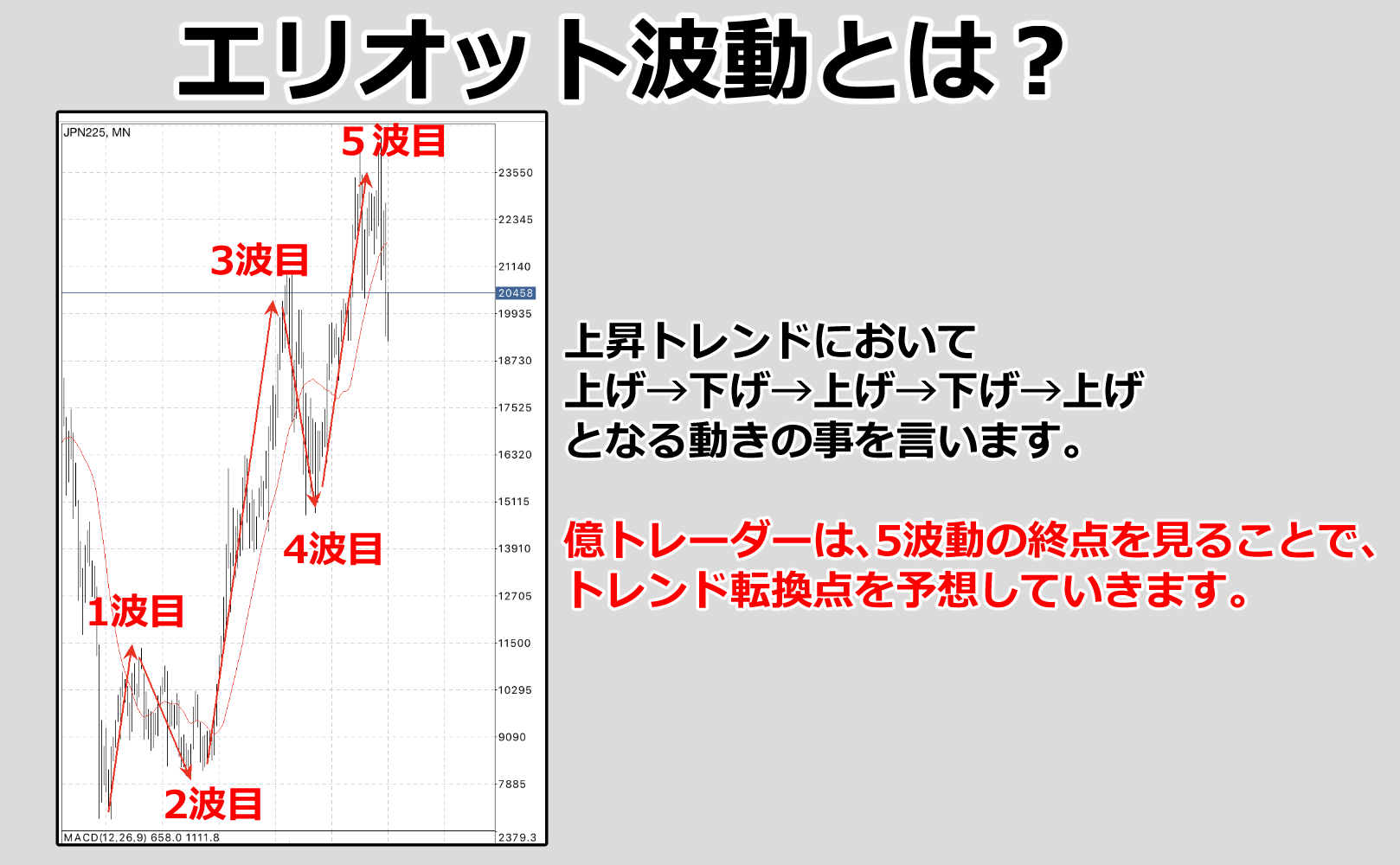 なのでこの5波動の終点を見ることで、株・FX・仮想通貨・商品先物で、トレンド転換点を予想していきます。