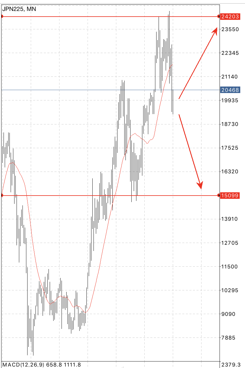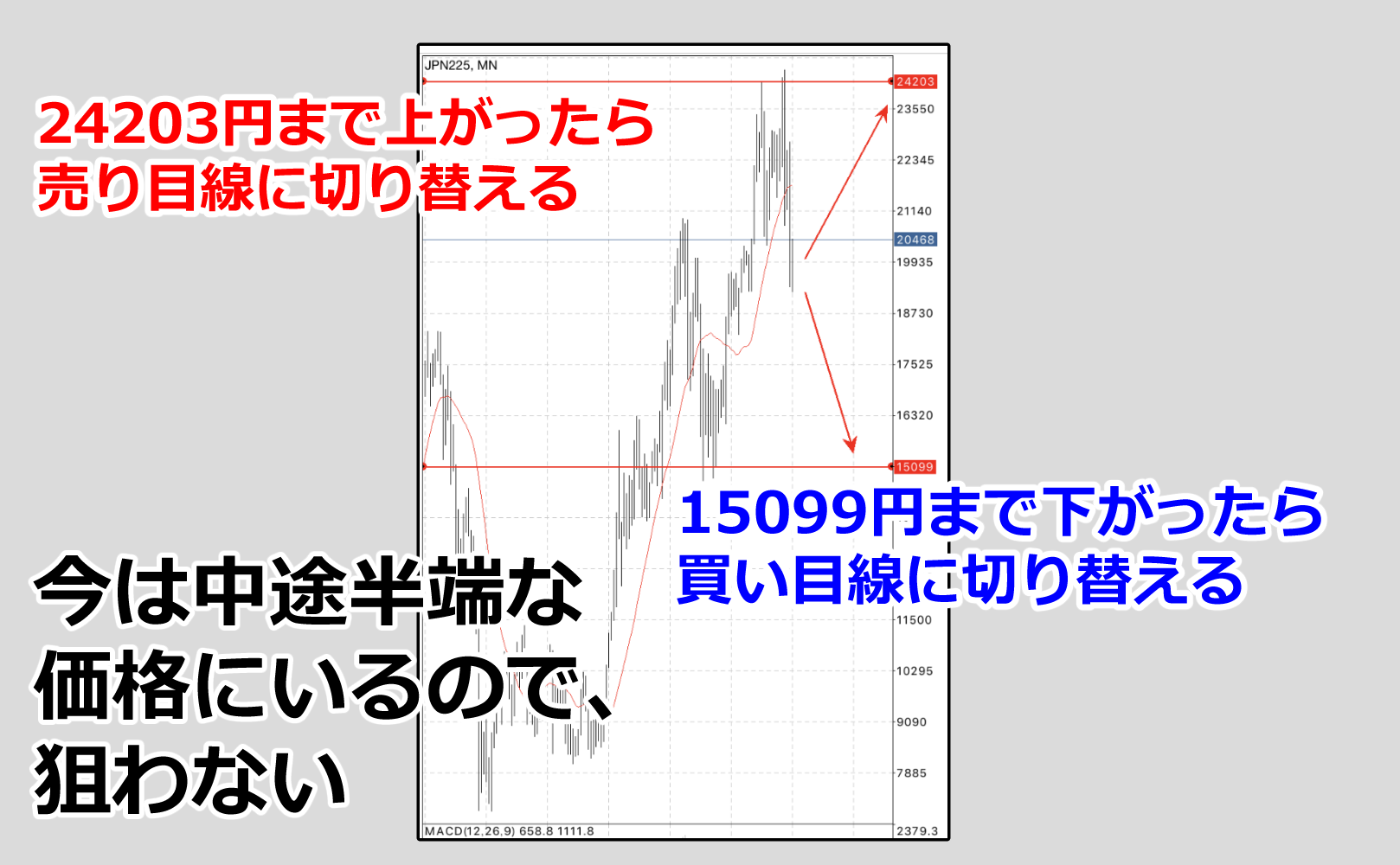 今年の株価の動きとして、ここから24203円まで上昇してきた場合は売り目線、15099円まで落ちてきた場合は買い目線で考えていきます。