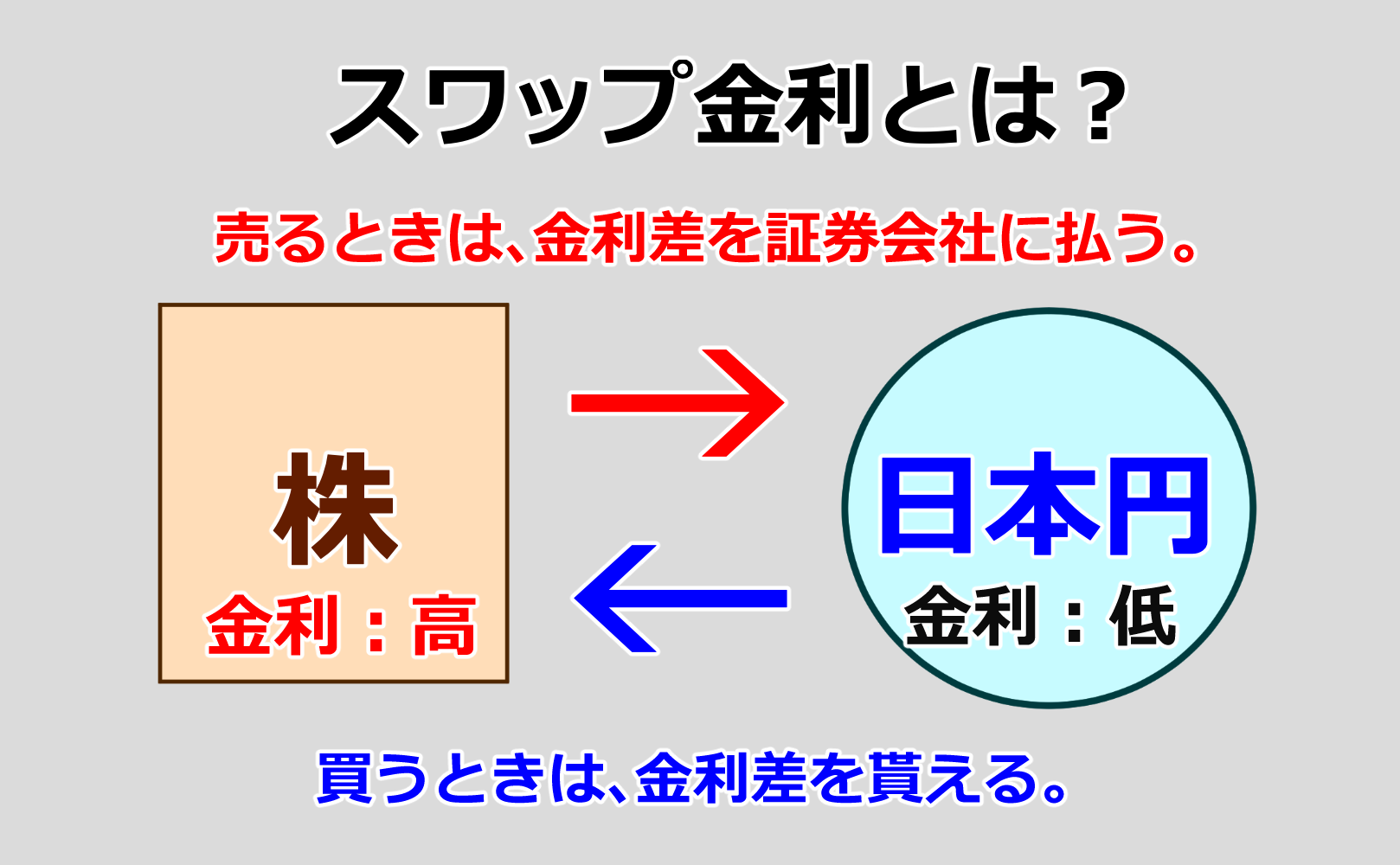 スワップ金利というのは、株価の金利が大きく、日本円の金利が小さい場合、株価を売るときに金利差だけ証券会社に払う必要がある額を言います。