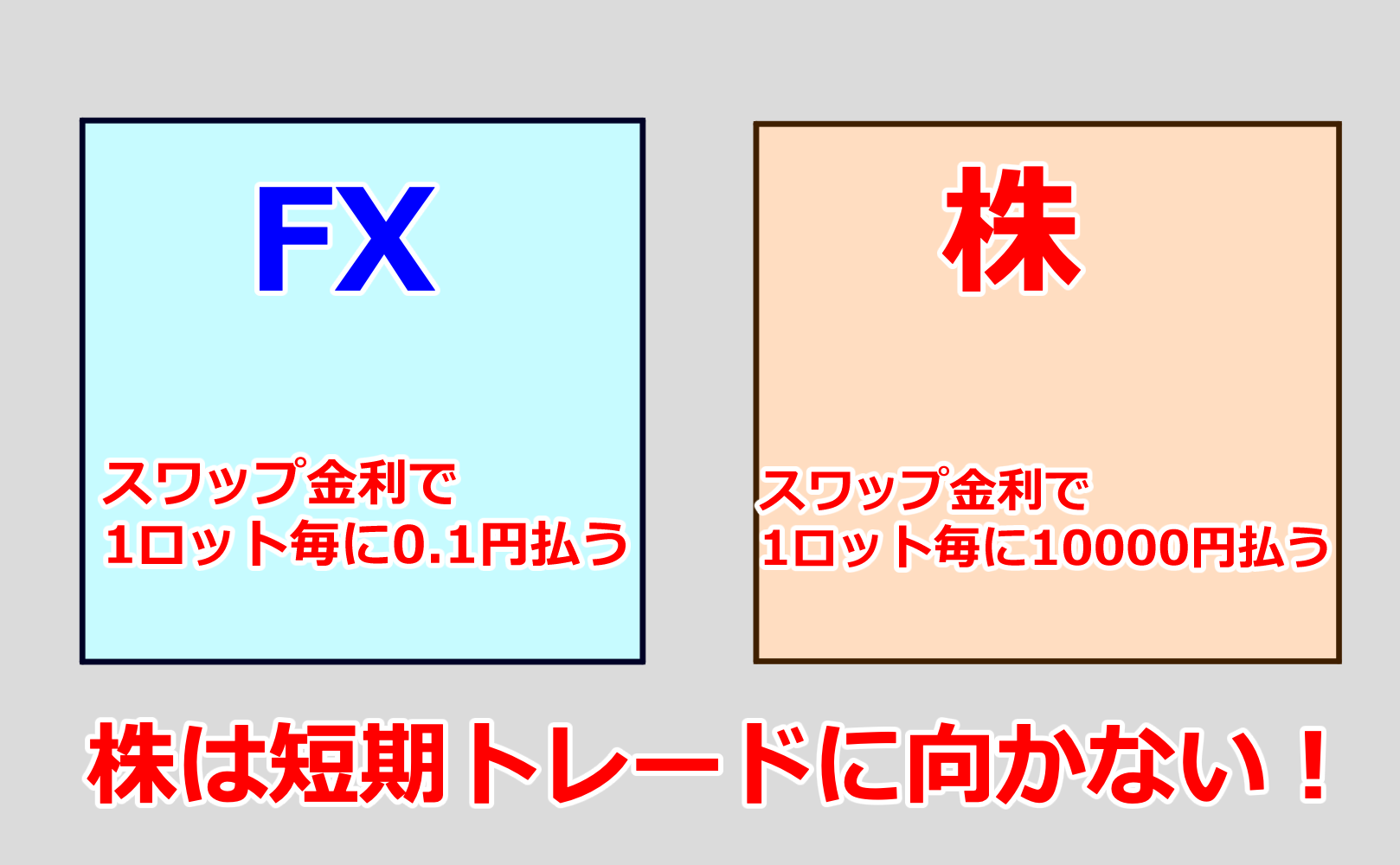 FXの場合は1ロット毎のスワップ金利が小さいので、短期トレードでスワップ金利を払う必要が出てきてもさほど痛くないですが、株価の場合にスワップ金利を払う場面が出てくると、短期で辛くなるわけです。