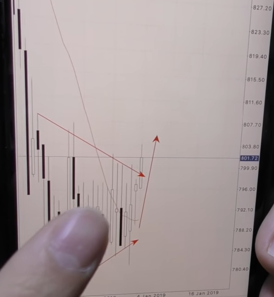 このように三角持ち合いといって高値が切り下がり、安値は切り上がってきている状態から若干上抜けてきているようにも捉えられる展開となっています。