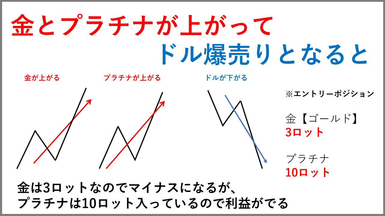 というのも、金とプラチナがどちらも上がりドル爆売りとなれば金はマイナスになりますが、プラチナは10ロットはいってるため金のマイナス分よりプラチナの利益の方が多く残ります。