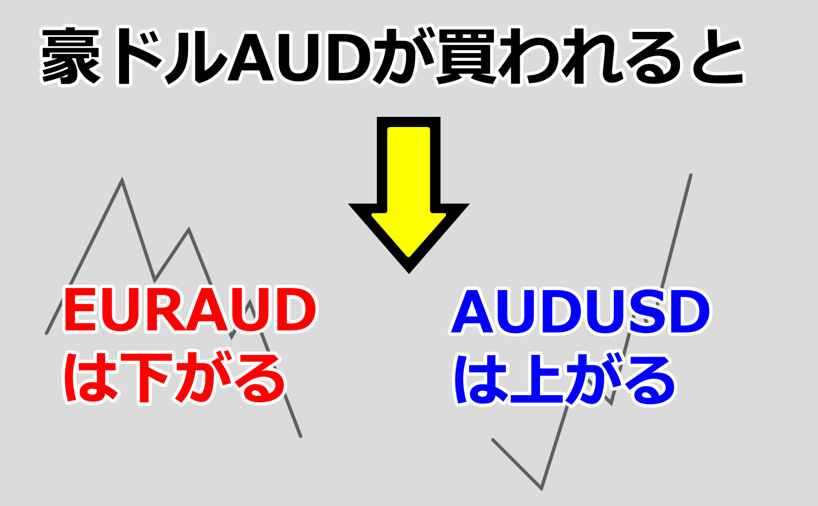 EUR(ユーロ)=USD(ドル)ということから、AUD(豪ドル)が買われたらAUDUSDは上がり、EURAUDは下がります。