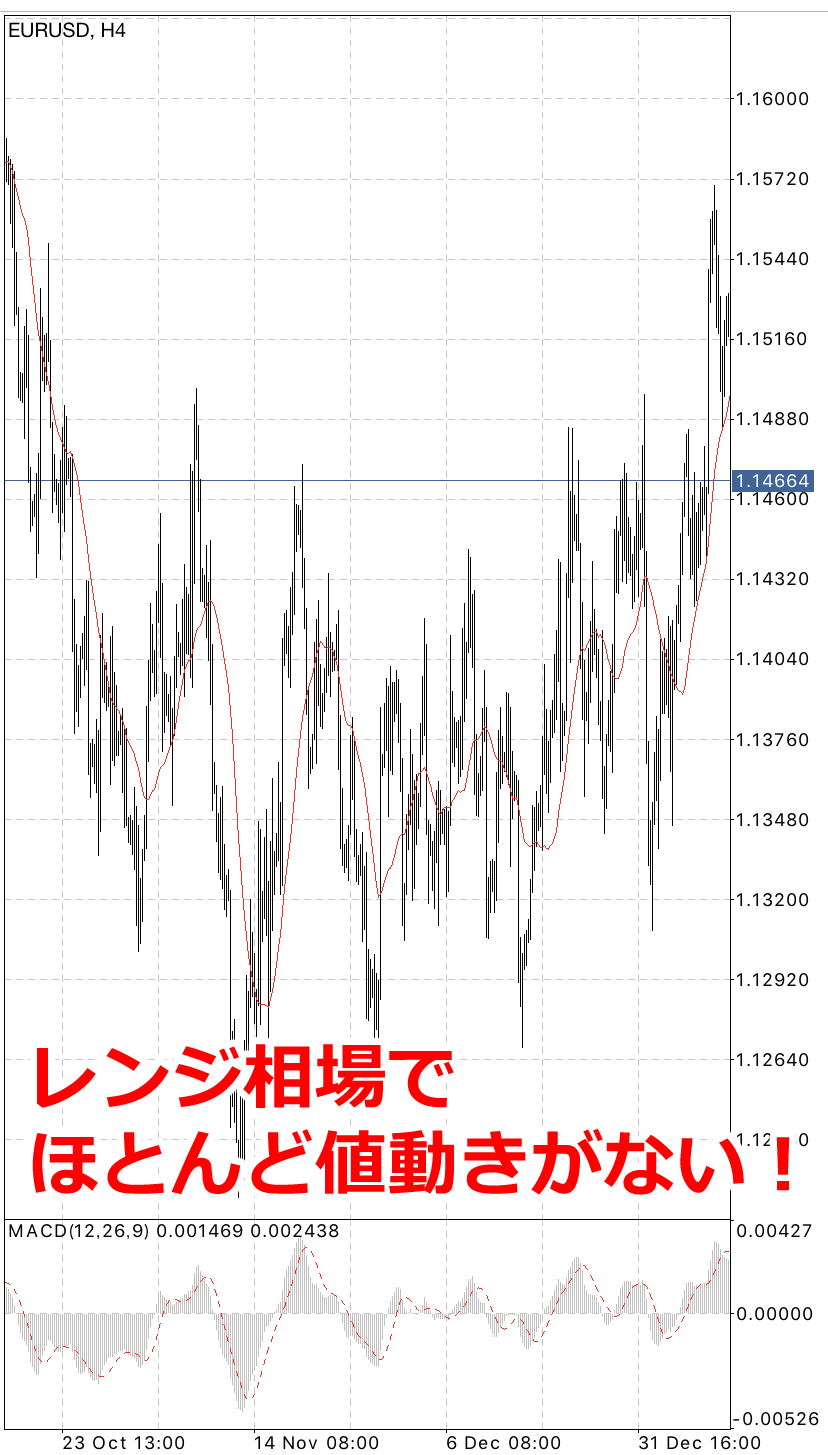ちなみに、レンジ相場というのは同じような価格帯の間を行ったり来たりして、上にも下にも突き抜けていかない相場のことを指します。
