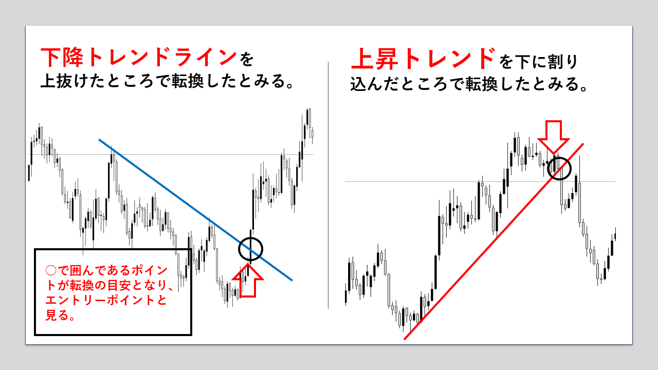 わからないかたのために簡単に解説するとチャート上の価格というのは常に上下していますが価格が少しづつ上下しながらも一方向に上げ続けたり、反対に下げ続け価値が下がっていくことがあります。