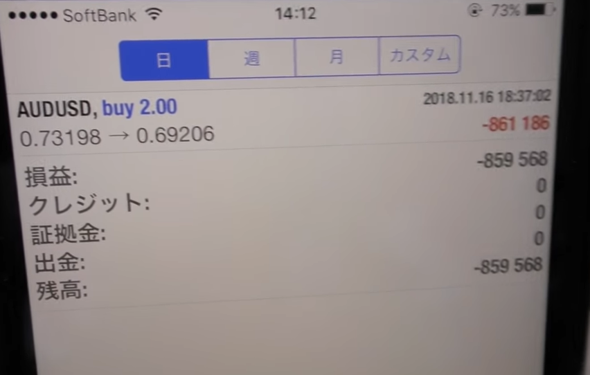 そして実際の決済の画面をお見せしますが、オージードル【AUDUSD】がなんと80万円もの損失でロスカットの展開に泣