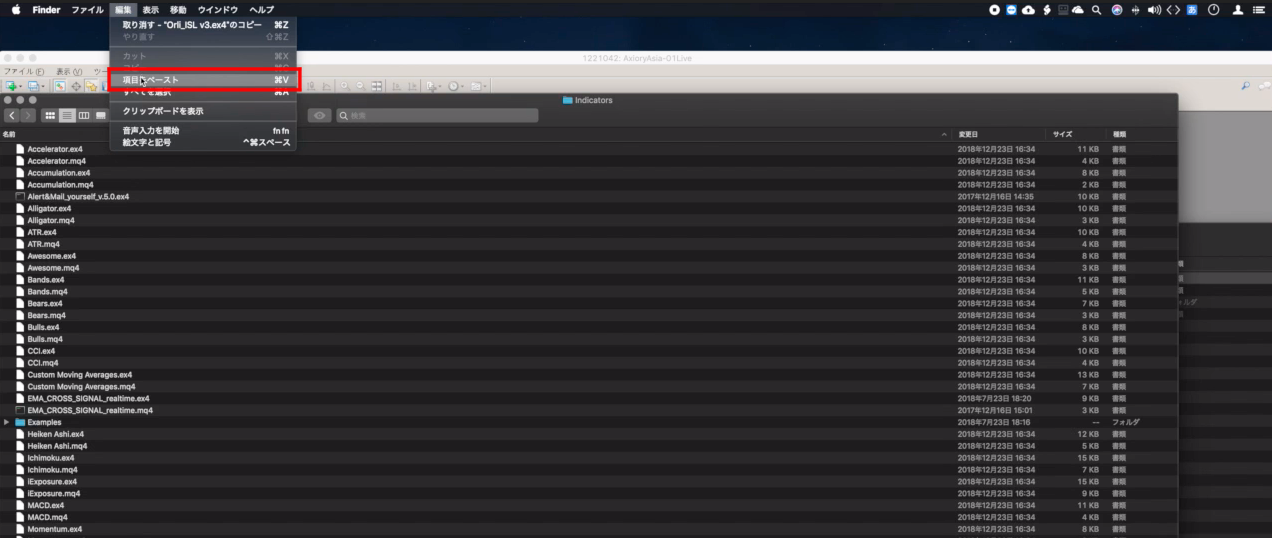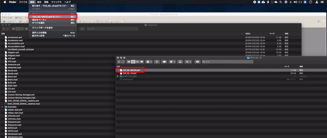 13. ダウンロードフォルダに保存している「Orli_MACD.ex4」を選択し、上メニューから「編集」→「コピー」を押してください。