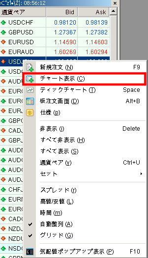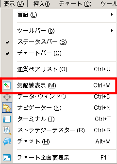 2.上メニューから「表示」→「気配値」と押すと通貨ペアが出てきます。