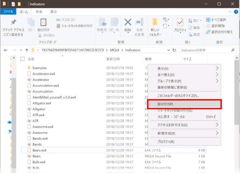 8.「Indicators」フォルダの上で右クリック→貼り付けを押してください。