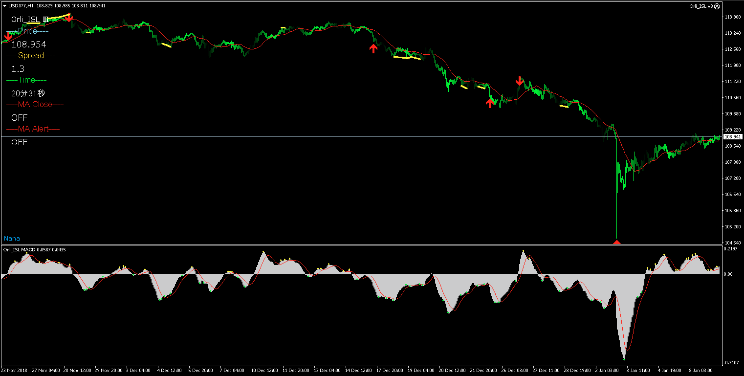 4. 左のナビゲーターウィンドウから「インディケータ」にある 「 Orli_MACD 」を選択してダブルクリックします。