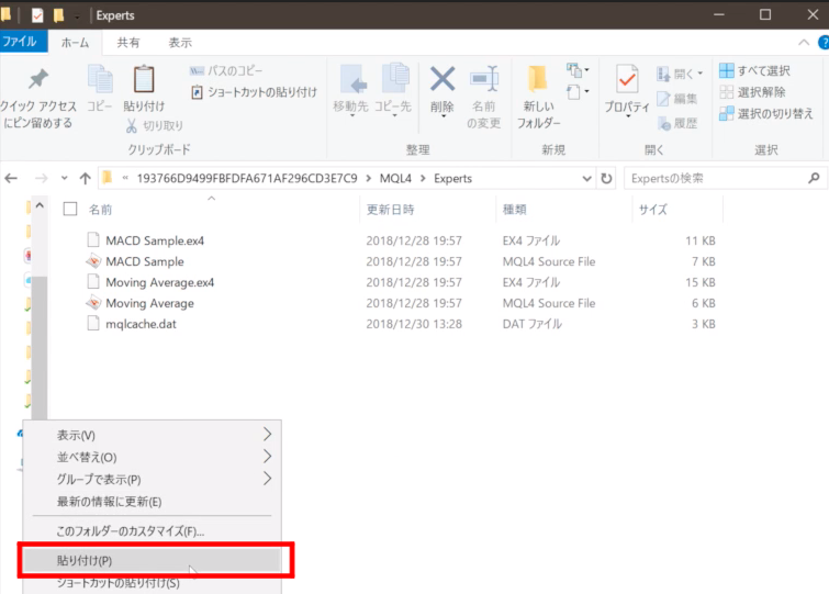 5.「Experts」フォルダの上で右クリック→貼り付けを押してください。