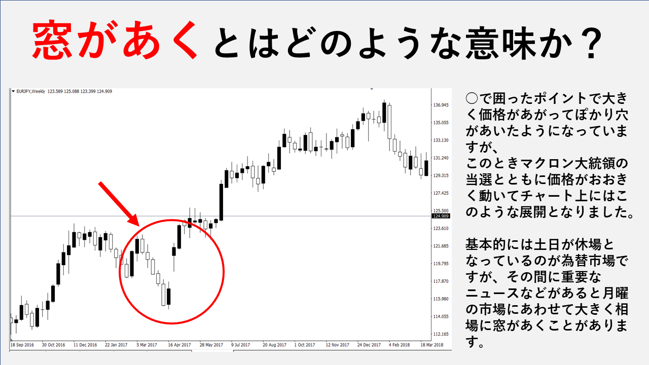 このことを為替や株の取引をしているトレーダーを中心に専門用語で窓とよび窓があいたなどと言ったりします。