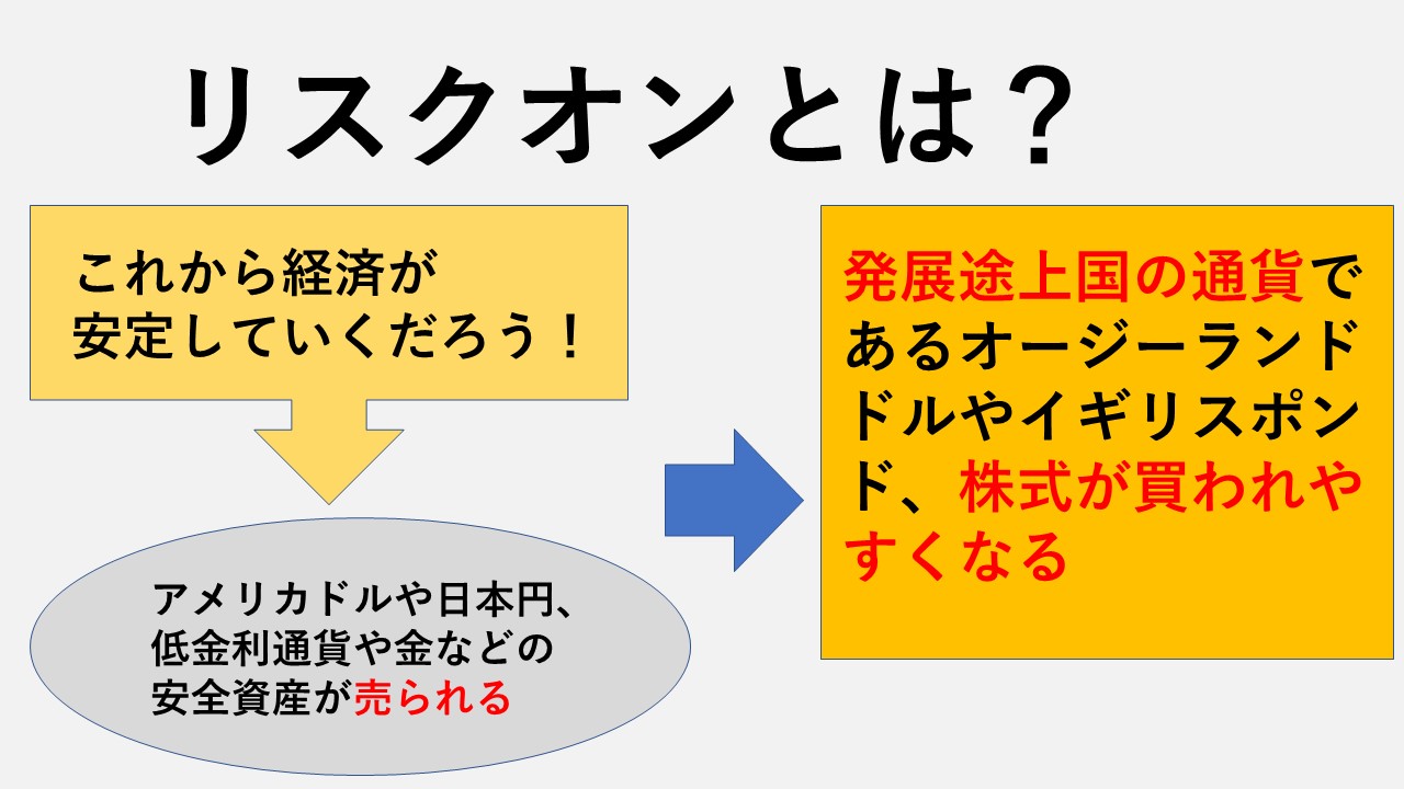 このリスクオンというのが、今後の経済が安定していくだろうとの見方から安全資産といわれる円や、ドル、金などを売って金利の高い発展途上国の通貨や株式などに積極的な投資が増えることをさします。