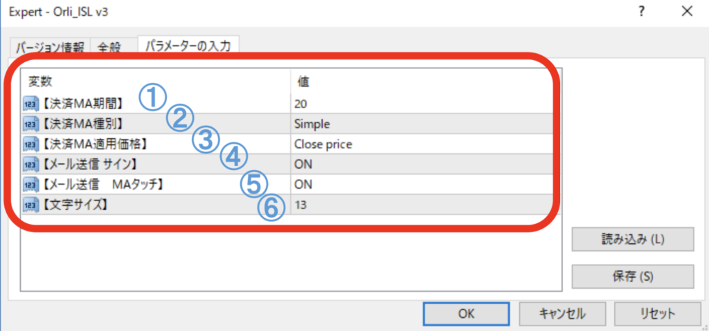 オーリーアイランド3をチャート上でセットアップするときに出てくる画面で設定できます。