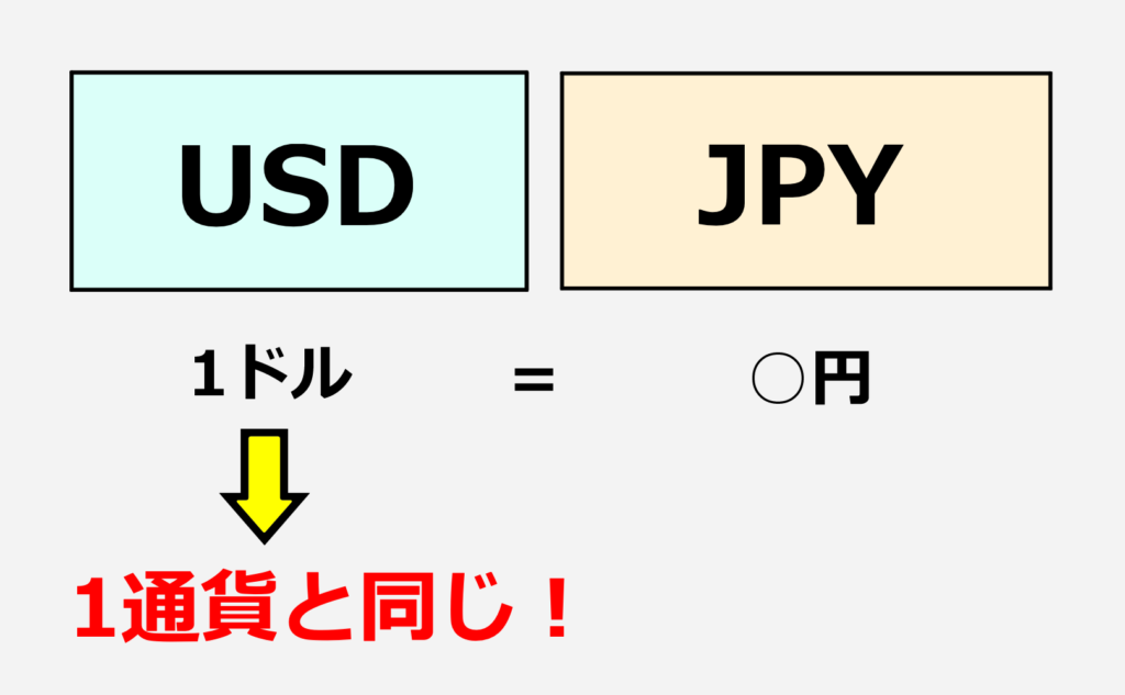 なので、このUSDJPY(ドル円)の場合は「1ドル(USD) = 1通貨 = 100円」となるわけですね!
