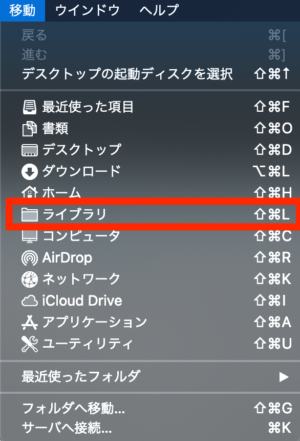 1.Finderを開いていただき、optionキーを押しながら画面上部の移動をクリックします。