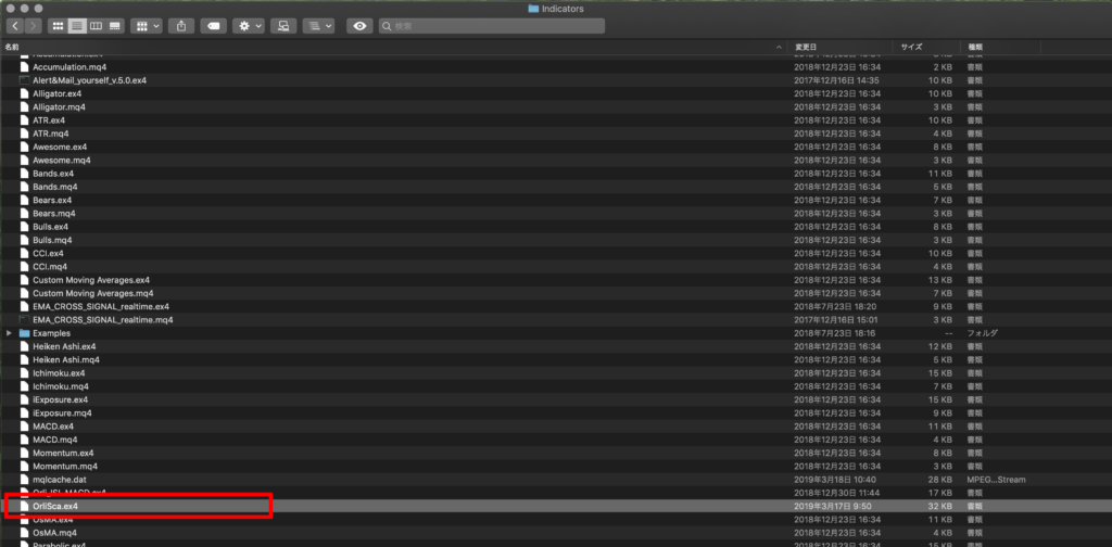 11.Indicatorsフォルダ内に「OrliSca.ex4」が保存されたのを確認します。