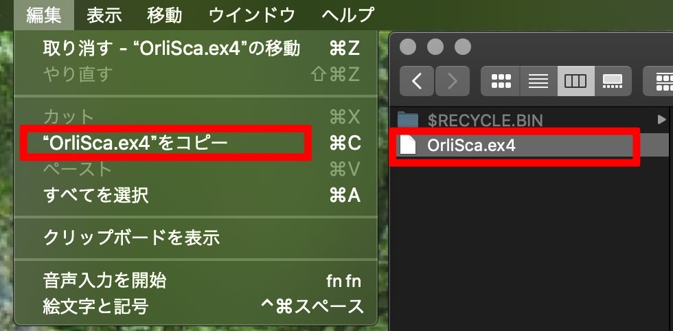 9.ダウンロードフォルダに保存された「OrliSca.ex4」を選んで、上メニューの「編集」をクリックして「OrliSca.ex4 をコピー」をクリックしてください。
