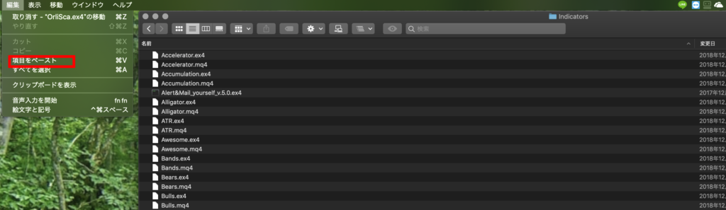 3.「indicators」フォルダーを開いたらダウンロードしたオリスキャのMQL4ファイルを選択しコピーし、このindicatorsフォルダー内に貼り付けをして、