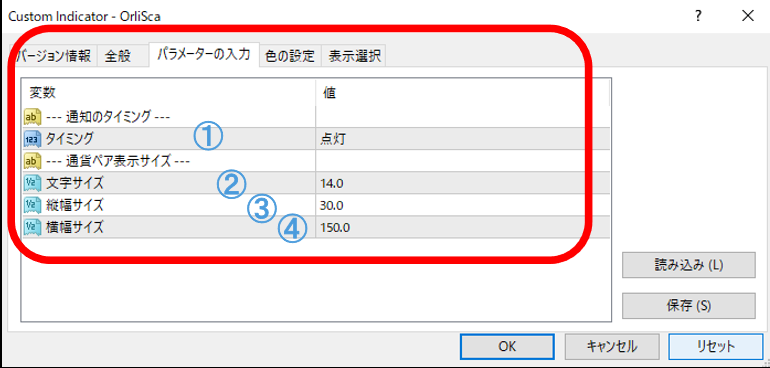 Orlisca.ex4には4つの設定項目があり、ご自身の使いやすいように変更していただくことができます。