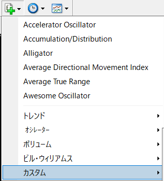 まず、MT4を起動させたら上部にある「インディケーターリスト」を選択し「カスタム」をクリックします。