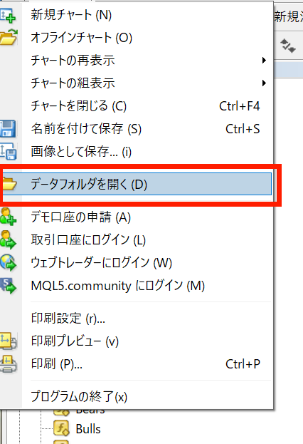 1.サインツールがダウンロードできたら、MT4を立ち上げていただき下記の画像の通りファイルを選択しデータフォルダーを開いてください。
