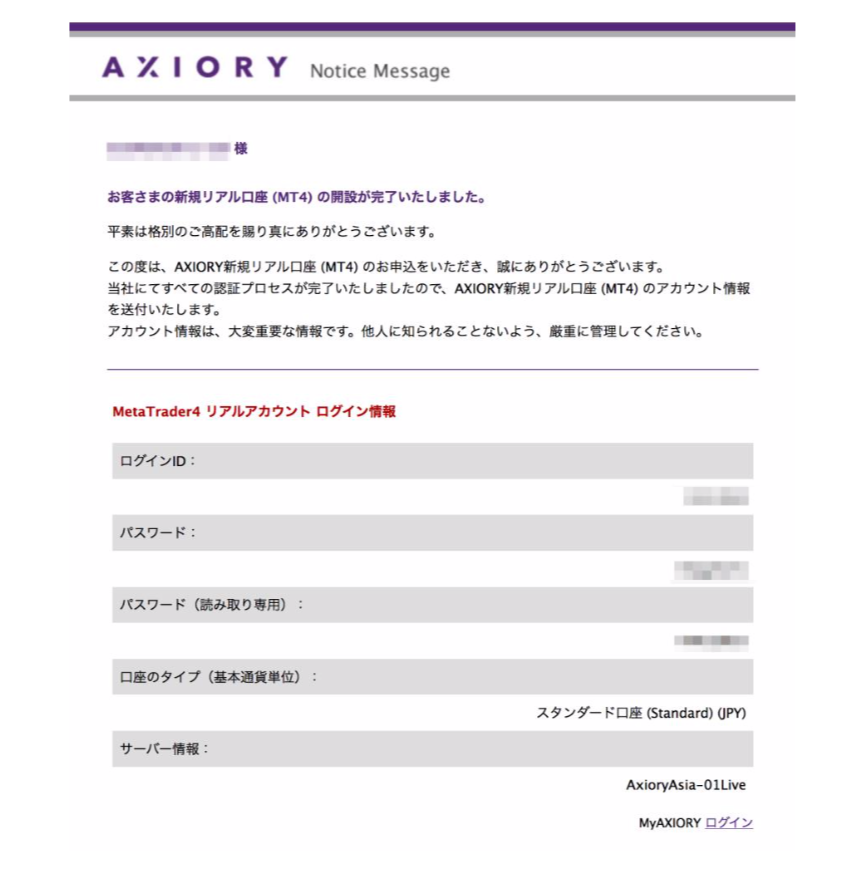 Axioryのリアル口座が開設されると、このようなメールが届きます。