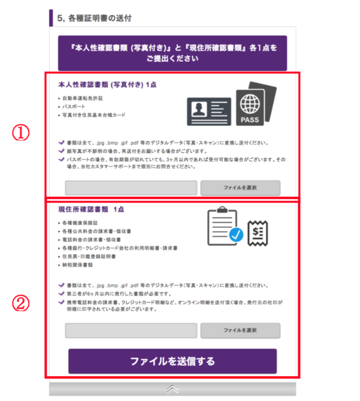 ②では保険証のスキャン画像がおすすめです。「ファイルを選択」から選んでください。