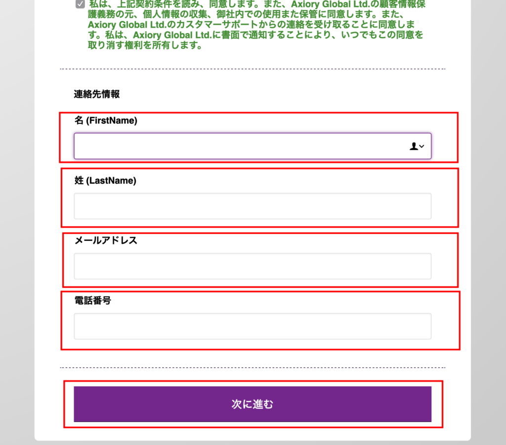 名前、苗字、メールアドレス、電話番号の順番に入力し、最後に「次へ進む」を押してください。