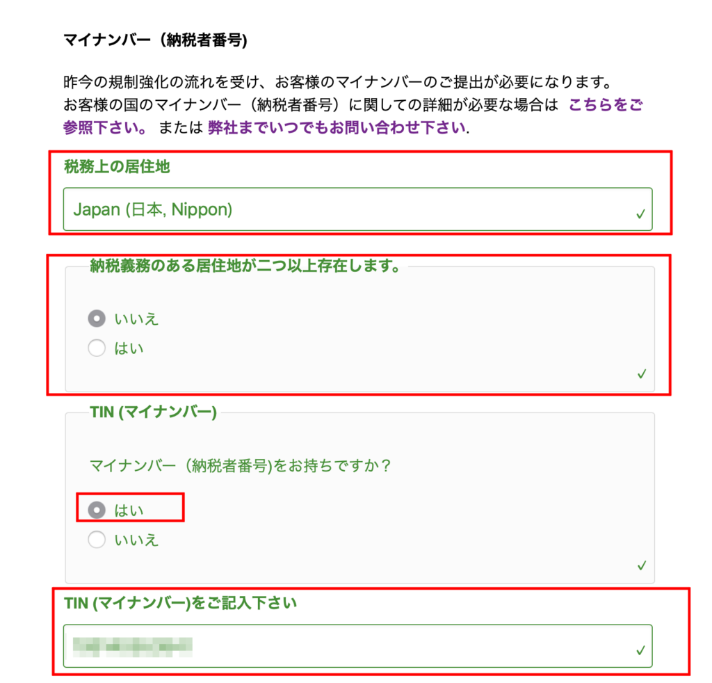 TIN(マイナンバー)には「はい」にチェックしてください。