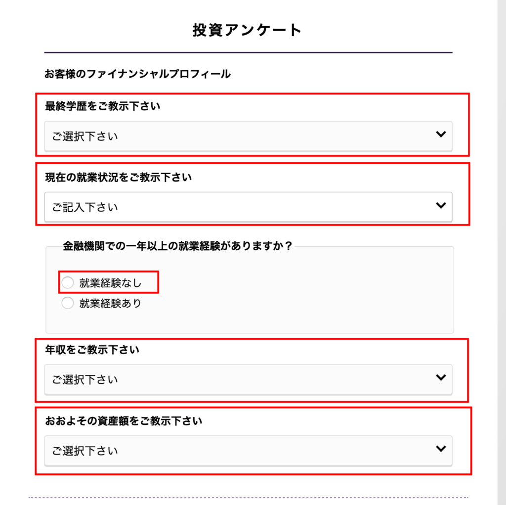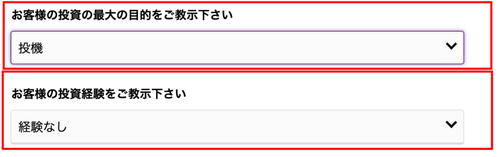 次に、投資目的と投資経験について聞かれますが、初心者であればそれぞれ「投機」「経験無し」で大丈夫です。