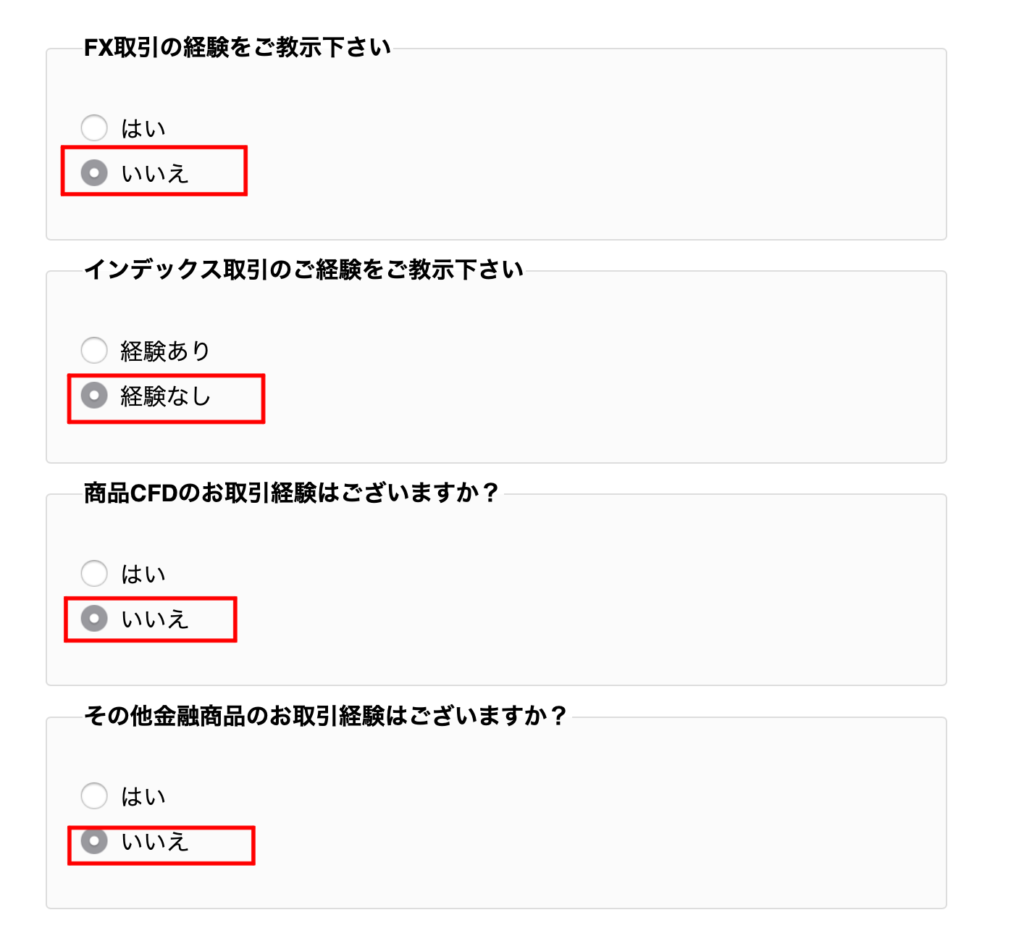 初心者であれば、次の取引経験は全て「いいえ」「経験なし」で大丈夫です。