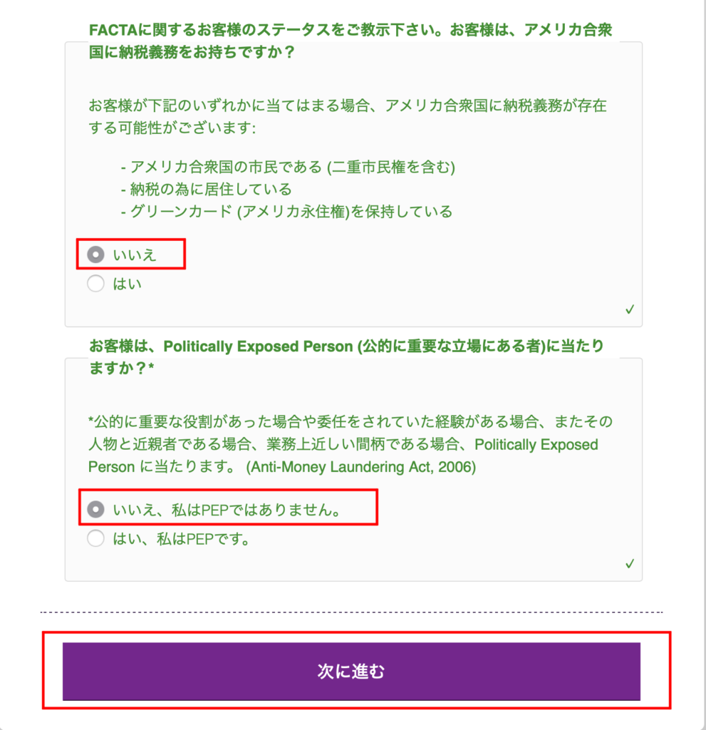 次にFACTAについて質問がありますが、どちらも「いいえ」にチェックしてください。最後に「次に進む」をクリック。