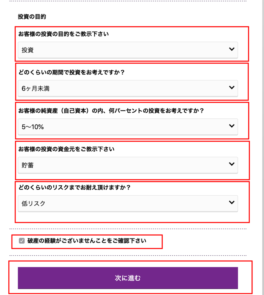 投資目的については、以下が回答例ですので、そのまま選択しても大丈夫です。