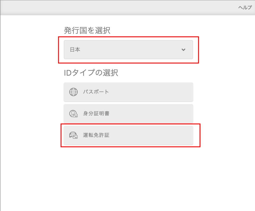 発行国は「日本」を選択し、IDタイプは「運転免許証」を押してください。