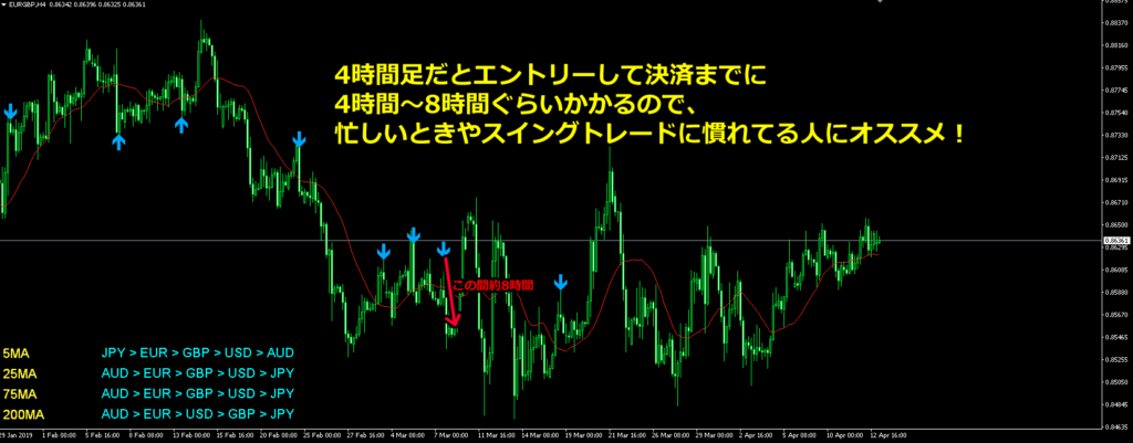 こちらはEURGBPの4時間足のチャートになるんですが、 僕は赤い矢印のところでエントリーしてみました!