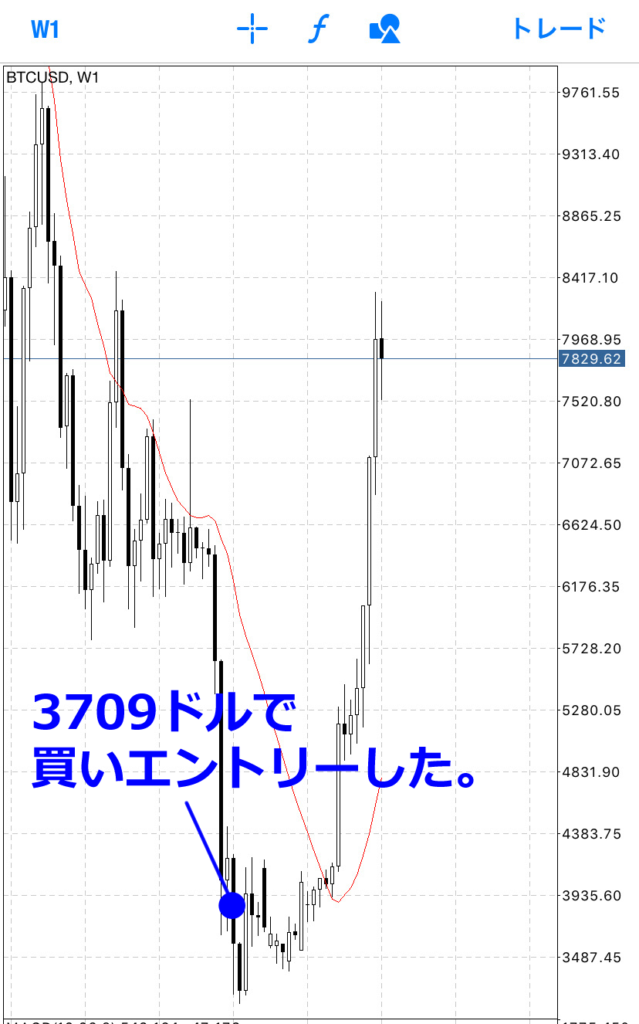 ビットコインが下がり続けて大衆トレーダーは「まだ下がる」と思う中、僕は先程のように買いエントリーで3709ドルで入り、大きく利益を出しましたね!