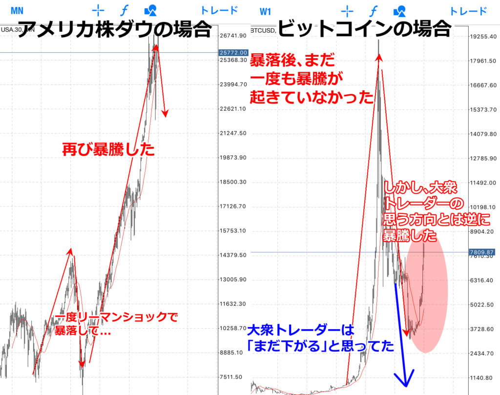 特にビットコインはアメリカ株ダウと違って暴落後の暴騰がまだ無かったので、「まだ下がるだろう」と考えてた大衆トレーダーが多かったわけです!