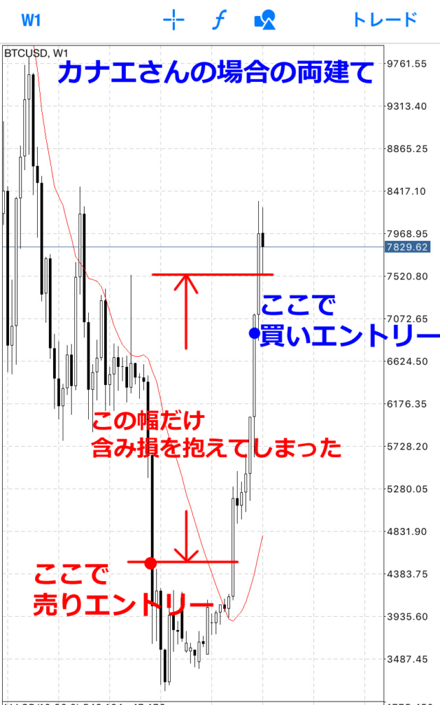 実は下で売りエントリーで、上で買いエントリーで両建てして含み損地獄になってます...。
