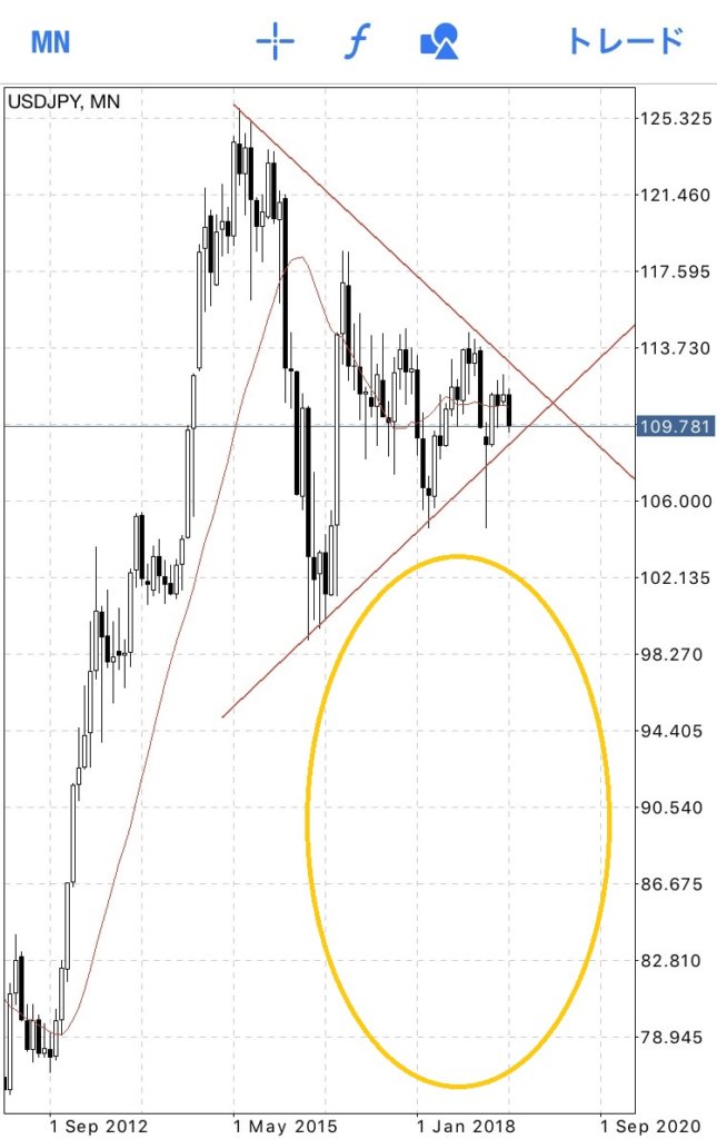 現在、実際のドル円の月足チャートでは三角持ち合いといって、上下のトレンドラインが収束してきている状況となっています!