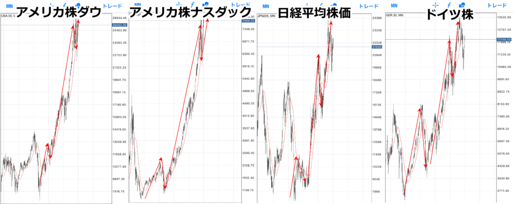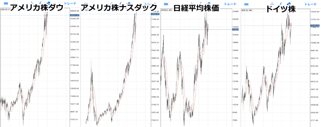 さて、こちらがアメリカ株ダウ・ナスダック・ 日経平均株価・ドイツ株のチャートになります。