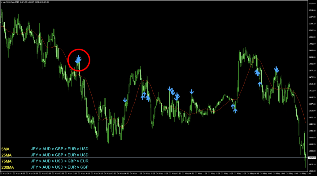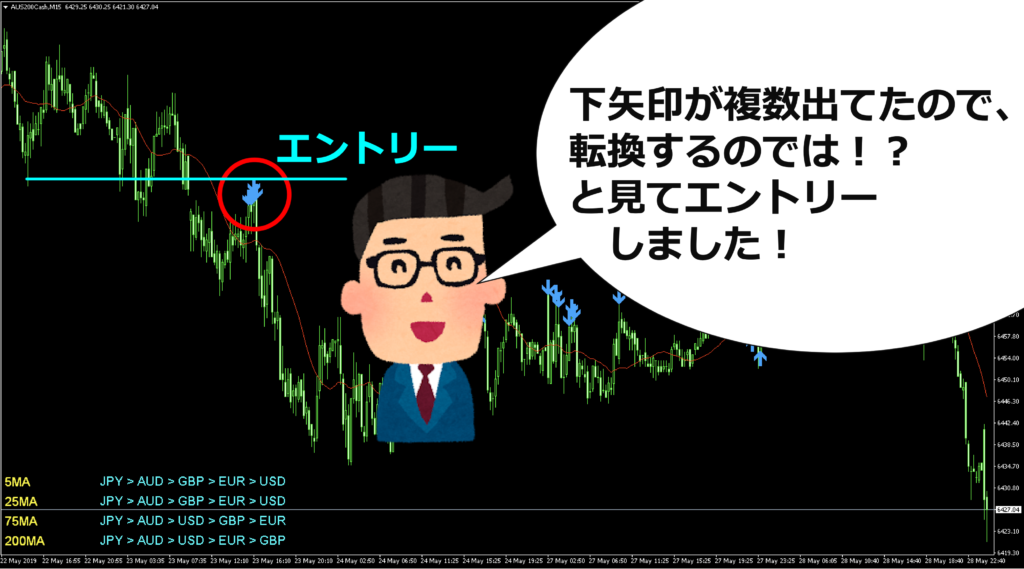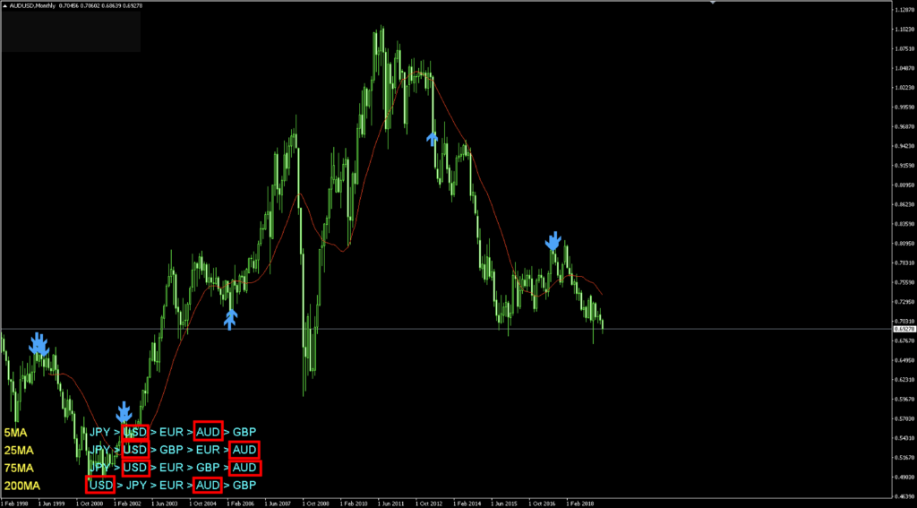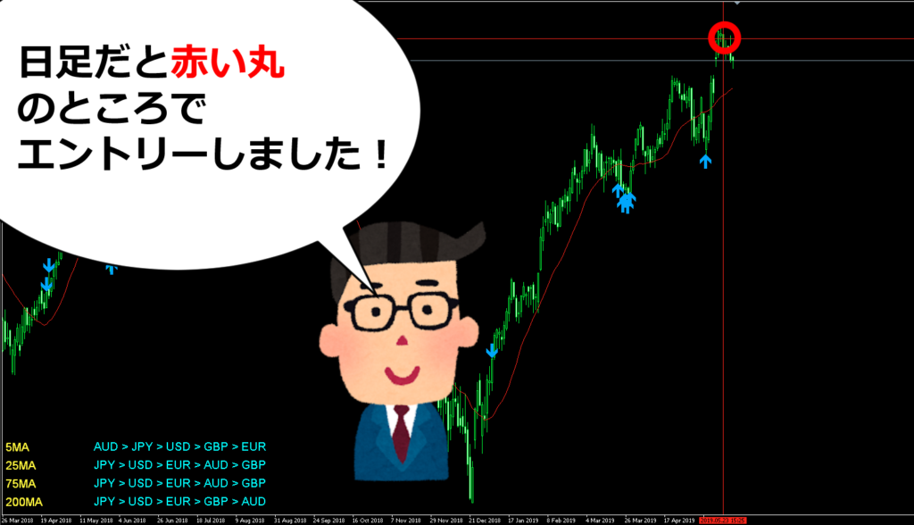 僕は通貨強弱の5MA、25MA、75MA、200MAでどれもAUDUSDがトレンドを形成すると考えました。