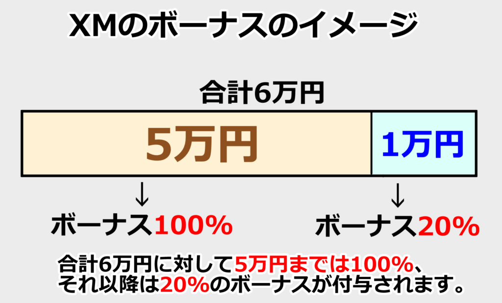 実はXMのボーナスは最初に口座を開設してから、次に2段階に分けてボーナスの比率が変わるんです!