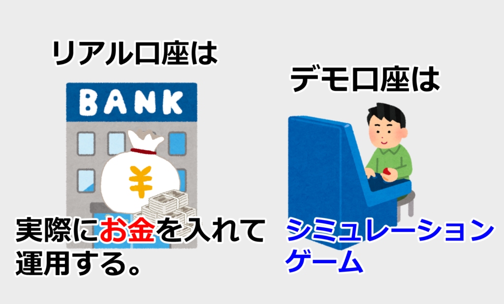 リアル口座は実際にお金を入れて運用する口座、デモ口座は架空のお金で運用する口座になります。