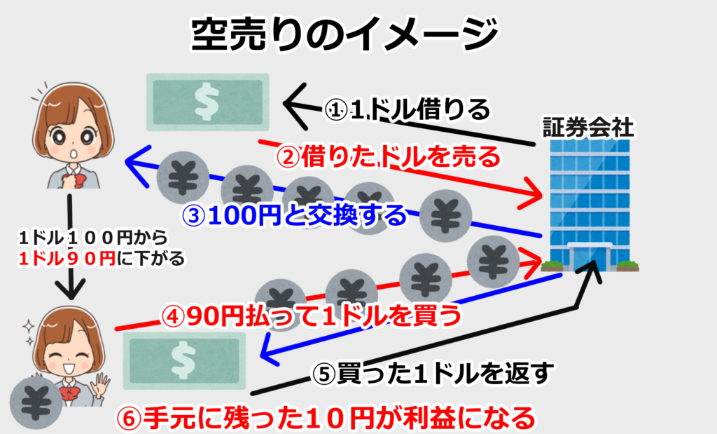 1ドル100円→90円に下がったとき、FXでは「空売り」をすることで利益にできるんです!!
